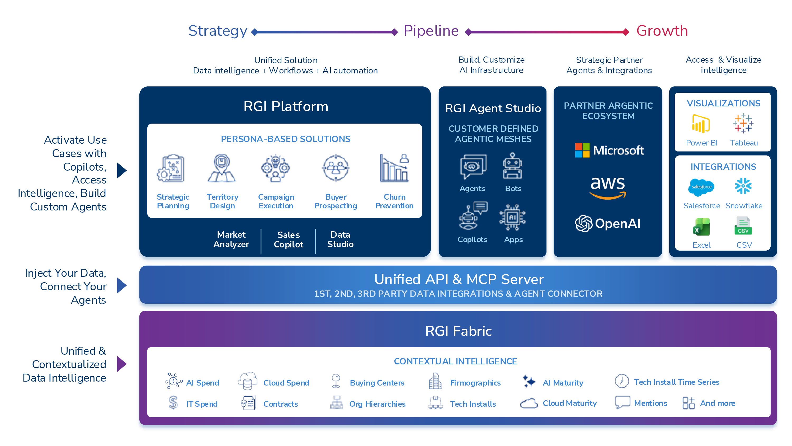 The RGI Platform is an AI-powered GTM platform that unifies precise technographic, spend, and intent intelligence with copilots and AI agents that act on it, closing the gap between insight and execution that holds back pipeline growth.